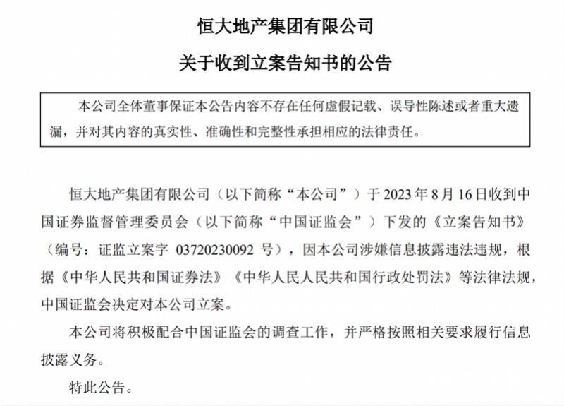 8月16日晚间,恒地面产集团有限公司于沪深来回所发布对于收到立案文书书的公告。
